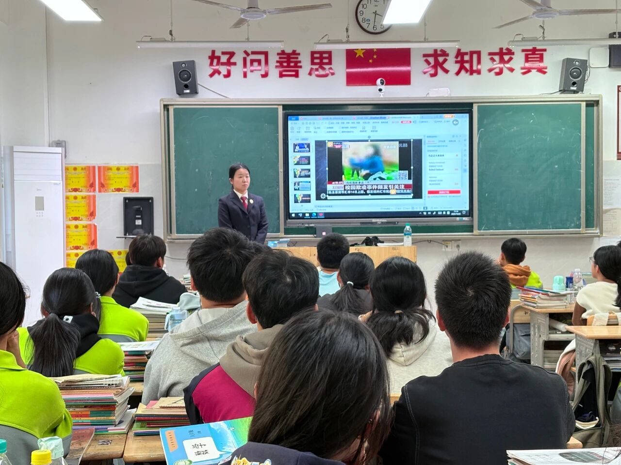 检察干警通过播放短视频、情景模拟等形式,全面介绍了校园欺凌的种类,重点讲解校园欺凌预防办法。同时,结合真实案例,用通俗易懂的语言,深入浅出地向同学们讲解了校园欺凌的法律知识,引导同学们增强法治意识,提高自我保护能力,勇敢对校园欺凌说“不”。